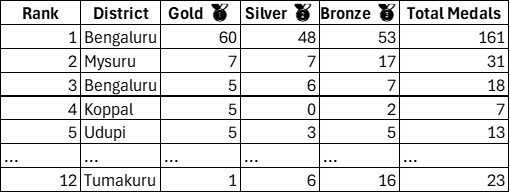 Bengaluru Urban (BU) completely dominated the games, securing the top spot with a massive lead in the medal count.